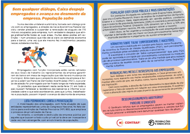 A manifestação denuncia a reestruturação que está acontecendo na Caixa, sem planejamento e negociação com os empregados. O ato cobra mais respeito da direção do banco e mais contratações. Empregados e a sociedade estão convidados a defender a Caixa 100% pública e contra o desmonte.