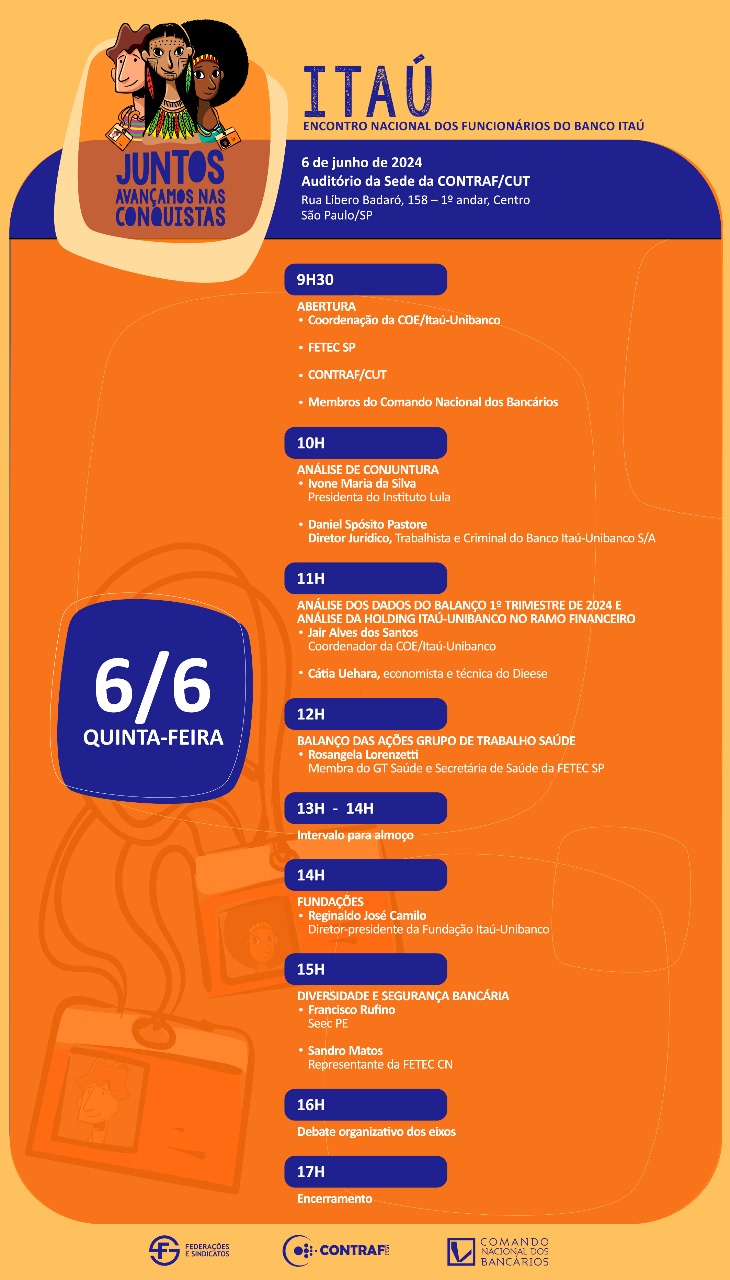 O Encontro Nacional dos Funcionários do Banco Itaú-Unibanco acontece nesta quinta-feira (6), na sede da Confederação Nacional dos Trabalhadores do Ramo Financeiro (Contraf-CUT) em São Paulo. Os trabalhadores debaterão emprego, remuneração, saúde, condições de trabalho, diversidade e previdência complementar.