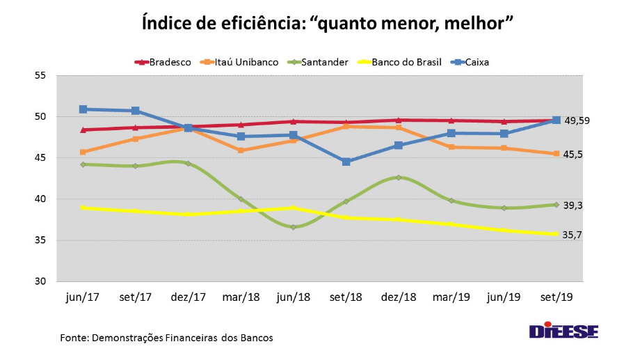 O banco esconde que seu desempenho é melhor do que o dos bancos privados, como mostram os índices de eficiência dos bancos do Banco Central. No gráfico de eficiência fica claro que a liderança do BB é histórica. Também no aspecto tecnológico, o banco se equipara ao mercado e não precisa se “adequar” para competir com os bancos privados.