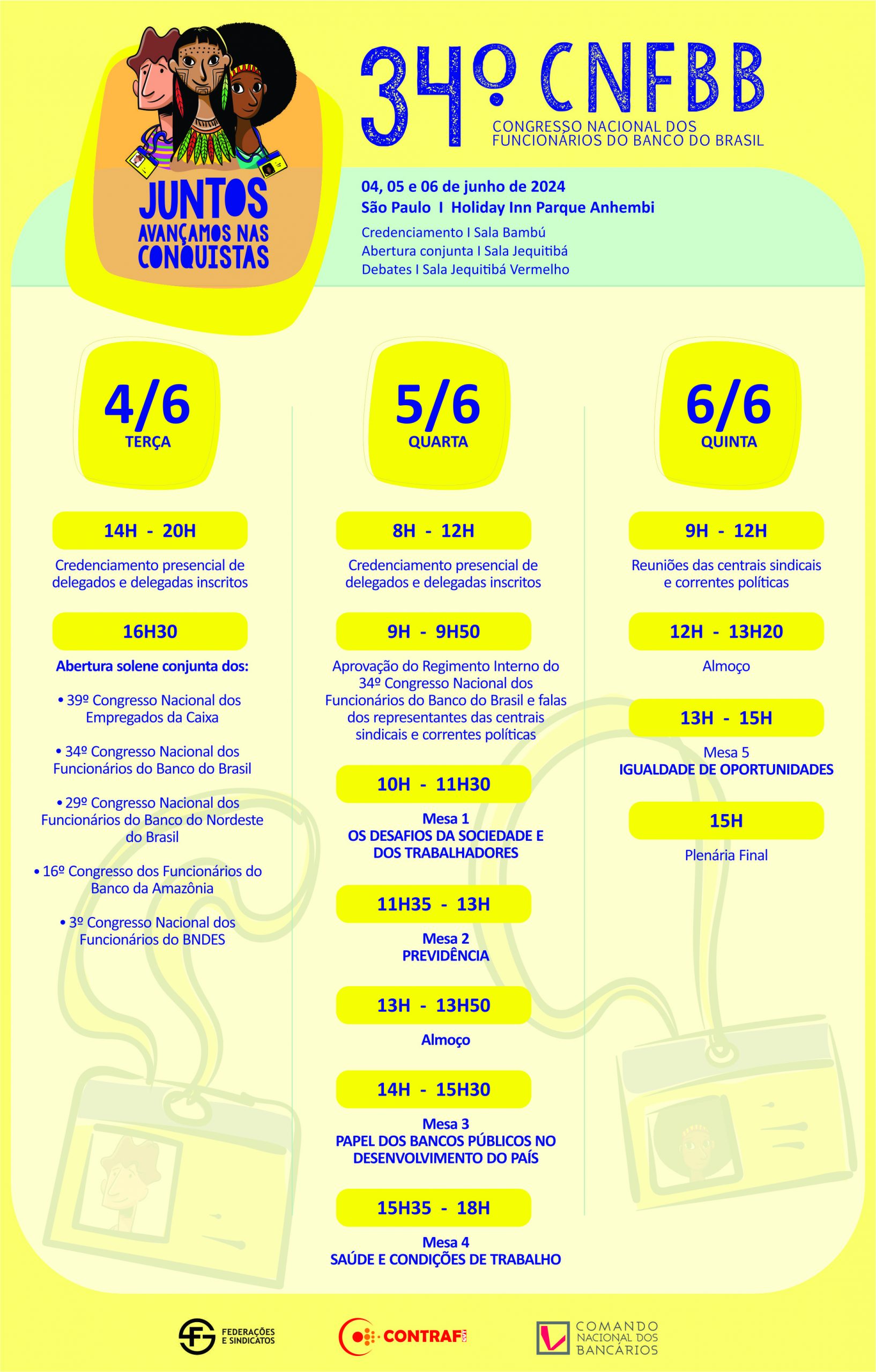 A Comissão de Empresa dos Funcionários do Banco do Brasil (CEBB) finalizou, na última quarta-feira (29), a programação dos debates do 34º Congresso Nacional dos Funcionários do BB que, neste ano, será realizado entre os dias 4 e 6 de junho, na capital de São Paulo.