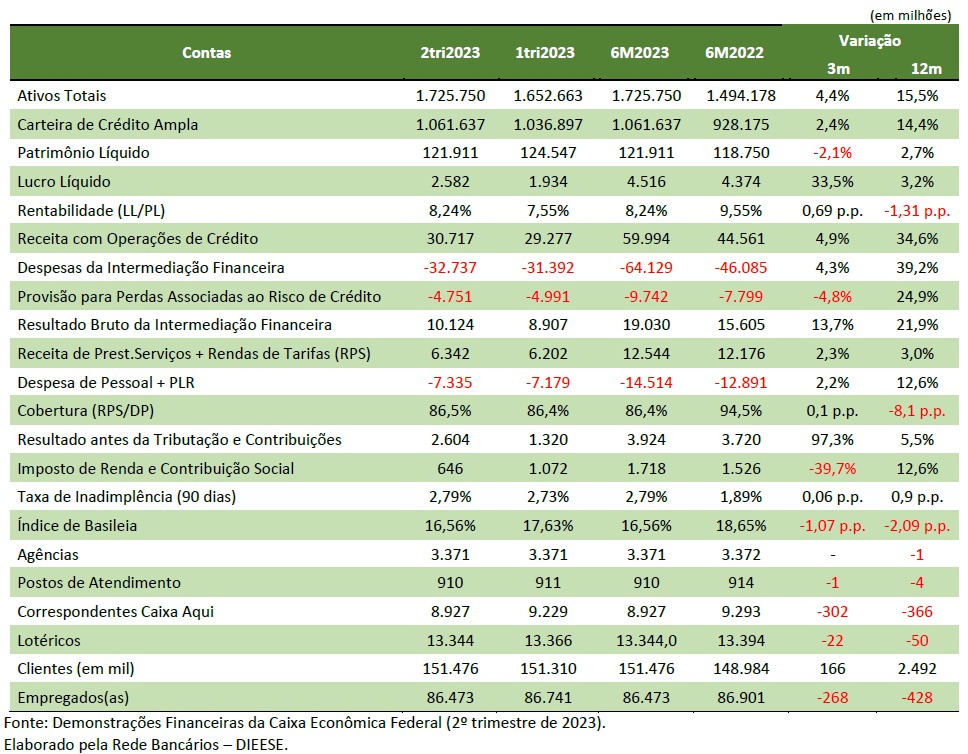 A Caixa Econômica Federal obteve lucro líquido recorrente de R$ 4,5 bilhões, no 1º semestre de 2023, crescimento de 3,2% em relação ao mesmo período de 2022. Considerando apenas o 2º trimestre, o lucro foi de R$ 2,6 bilhões, 33,5% maior do que o obtido no 1º trimestre de 2023. A rentabilidade sobre o patrimônio líquido do banco (ROE) ficou em 8,24%, 1,31 ponto percentual (p.p.) menor ao longo de doze meses e 0,69 p.p. maior no trimestre.