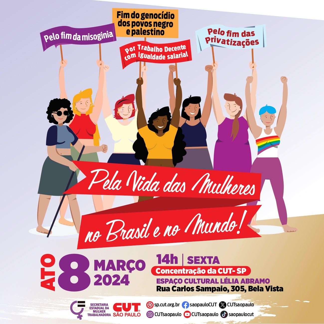 Na próxima sexta-feira (8), no Dia Internacional das Mulheres, haverá atos em diversas cidades do país promovidos pelas CUT’s estaduais. O tema deste ano é “Mulheres em defesa da democracia pela igualdade salarial e contra todos os tipos de violência”.
