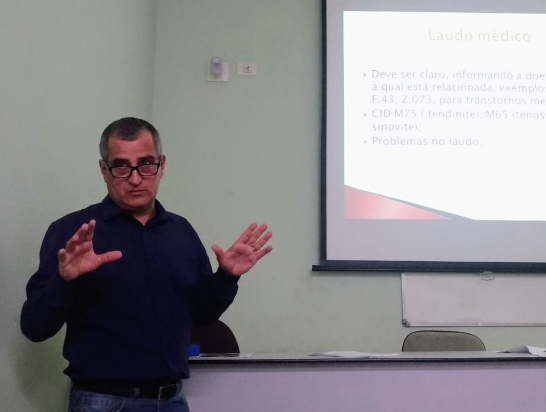 Durante a palestra, Sílvio Rodrigues e Natal Gomes falaram sobre a atual realidade vivida pelo bancário adoecido e sobre a importância do reconhecimento da doença, pelo INSS, como sendo decorrente do trabalho.