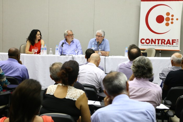 É fundamental derrotar as teses do liberalismo econômico que querem fragilizar o estado e ameaçam os direitos dos trabalhadores, como as mudanças na partilha do pré-sal e o Estatuto das Estatais do PLS 555. Para isso, é preciso intensificar a pressão no Congresso Nacional e mobilizar os trabalhadores. “O liberalismo econômico não tem limite. Nosso governo não é liberalista, é um governo acuado”, alertou o senador Roberto Requião (PMDB-Paraná) durante debate sobre a conjuntura nacional, na reunião do Comando Nacional dos Bancários 2016, que aconteceu nesta terça-feira (23) na sede da Contraf-CUT.